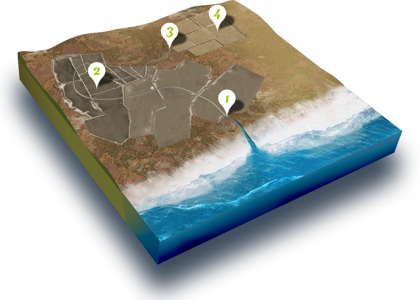 The sea water loses approximately 90% of its fresh water. So, the resulting brine, or very salty water, contains 260 g of salt per litre, in order to keep the salt marshes going.